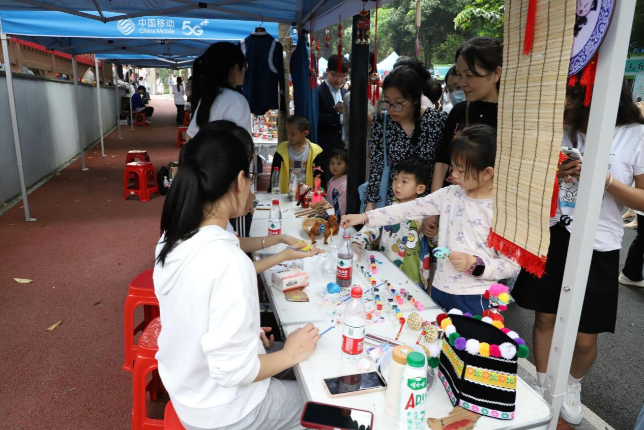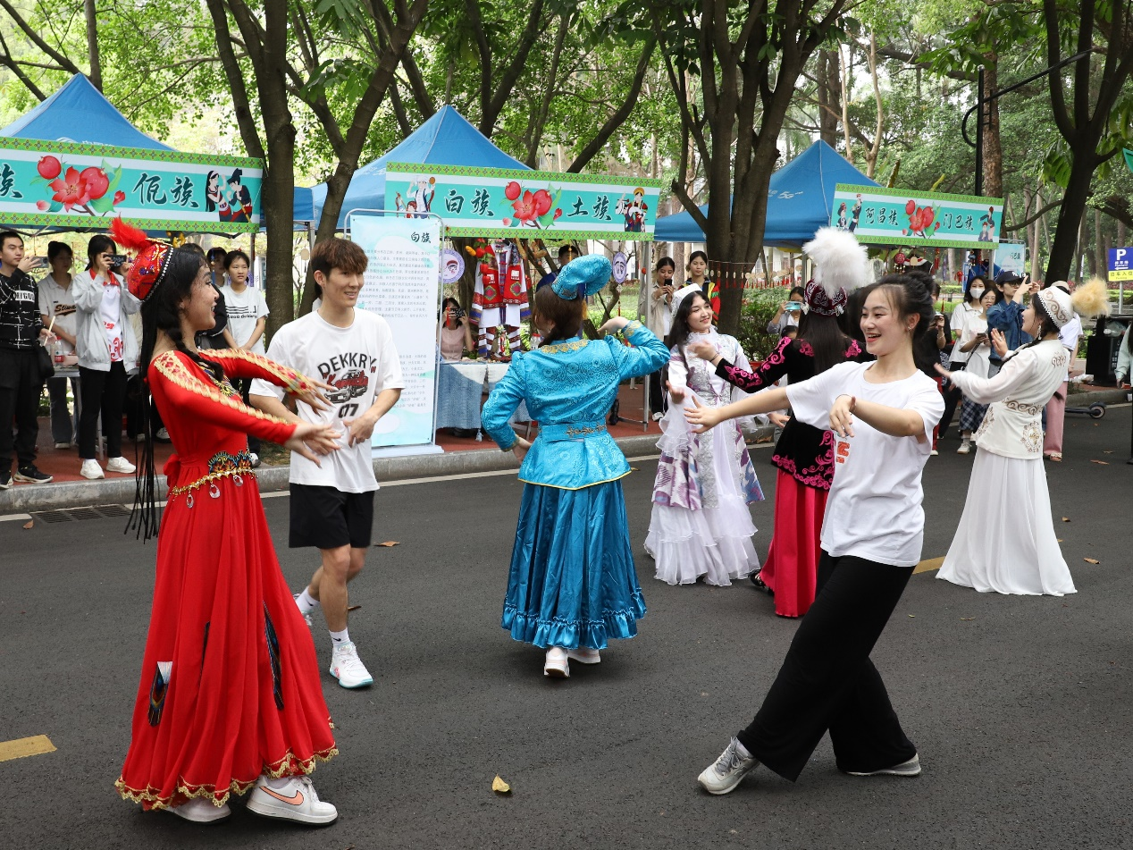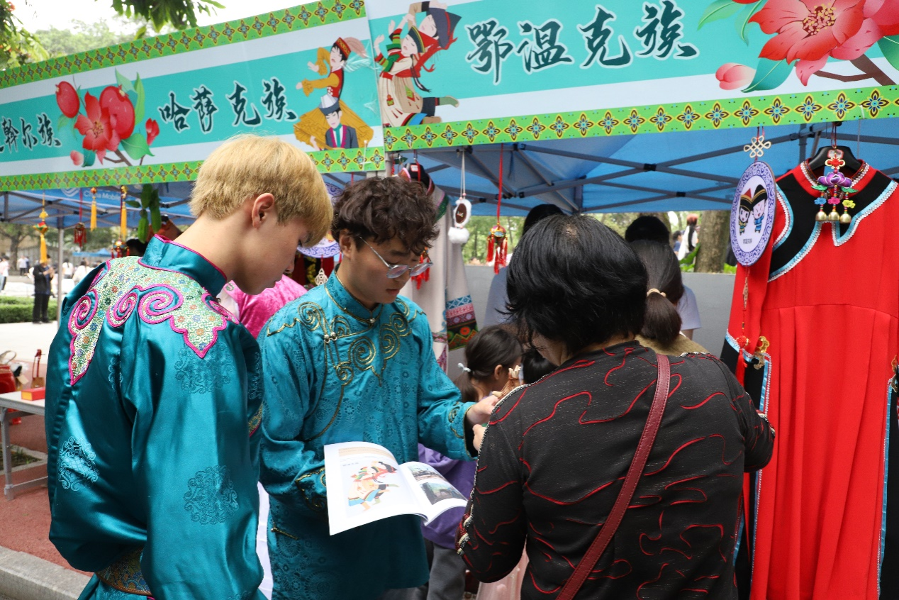 相思湖畔三月三,民族团结一家亲。此次民族风情展秉持着“一个民族都不能落”的原则,共设56个民族风情展区。各展区根据56个民族的风俗习惯,展示了丰富多彩的民族文化、特色物品等,设置风味美食品尝、民族服饰体验等活动。各展位均安排了本民族员工作为讲解员,同时配有相应的志愿者协助工作,他们结合展位的民族工艺品、民族美食等,向参观人员讲解该民族的文化与风俗,积极解答师生的疑问,帮助他们更好地了解各民族文化。