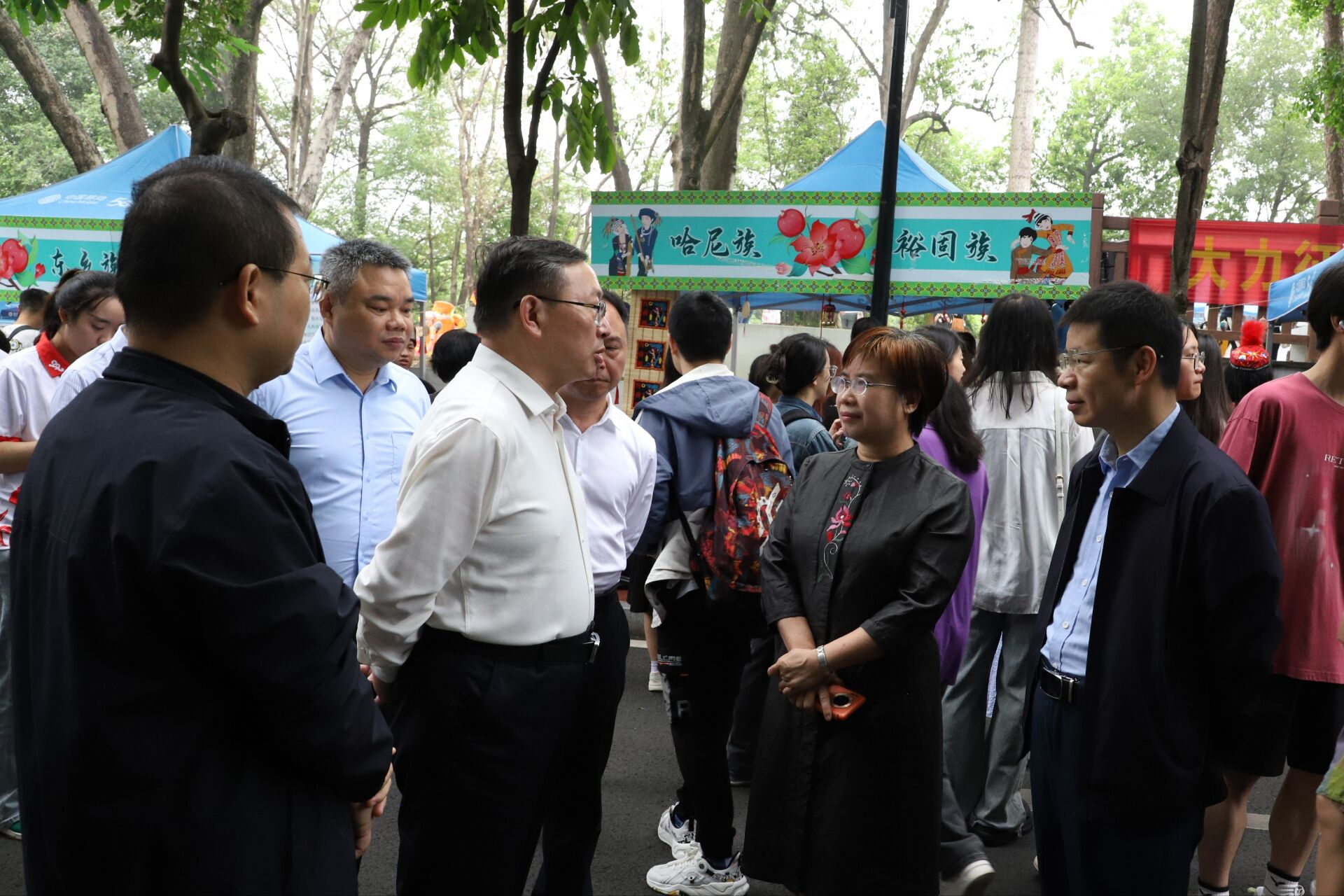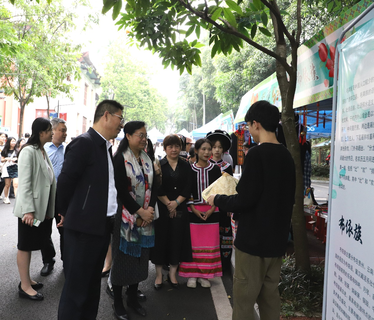领略民族特色风情,传承优秀传统文化。展区内,师生们通过试穿民族服饰、体验民族活动来感受民族风情、体验民族文化乐趣。师生与工作人员进行双向互动,通过参与展区的民族知识问答小活动,获取精美的小礼品,也借知识问答深刻领悟各民族文化的智与美。同时,每个展位前还摆放不同民族的特色美食供师生品尝,让大家在互动式、沉浸式的体验中感受多民族文化之美。