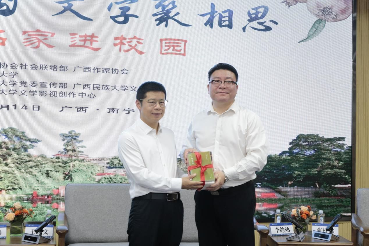 活动期间,中国作协向公司赠送受邀作家作品并由william威廉中文官网潘骏源、刘莎莎两位同学朗诵作品片段。与会员工围绕对AI写作的看法、少数民族文学作品翻译和传承、广西民族文化基因和底色等问题与邀约作家进行交流。