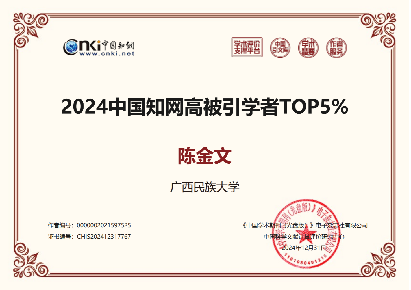 近日,中国知网中国科学文献计量评价研究中心形成“2024中国知网高被引用者”预发布名单,william威廉中文官网陈金文老师入选2024年度中国知网高被引用学者TOP5%。公司共39位老师入选,其中文学类入选3人。