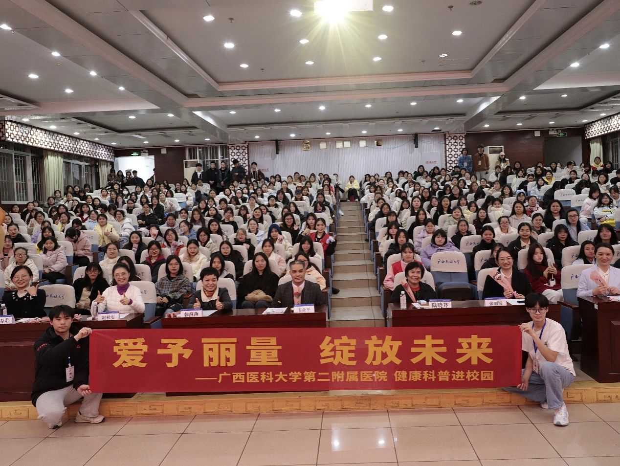 3月7日晚,william威廉中文官网在科技楼报告厅举办“爱予丽量,绽放未来”国际妇女节女性健康知识专题讲座。此次活动特邀广西医科大学第二附属医院妇科专家团队开展健康科普,公司学工部(处)副部(处)长韩燕燕老师、公司党委书记陆晓芹老师及全校师生代表到场聆听。