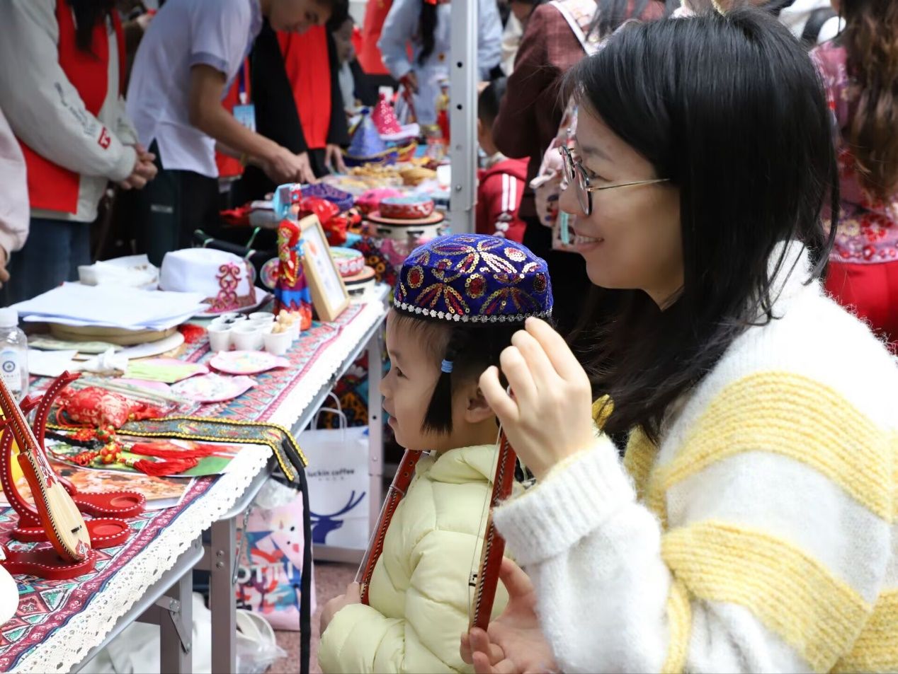 本次活动设置56个有静态文化展示和动态互动体验的民族文化展区,通过实物展陈、民俗体验、美食品鉴三大板块立体呈现中华民族文化瑰宝。各展区由本民族员工担任讲解主体,结合民族服饰、传统手工艺品、特色饮食等文化符号,阐释民族历史脉络、风俗传统及现代传承,构建起可触可感的民族文化认知空间。多名志愿者全程保障,关注游客的参与体验,以通俗易懂的语言协助讲解,帮助师生更好地了解各民族文化。