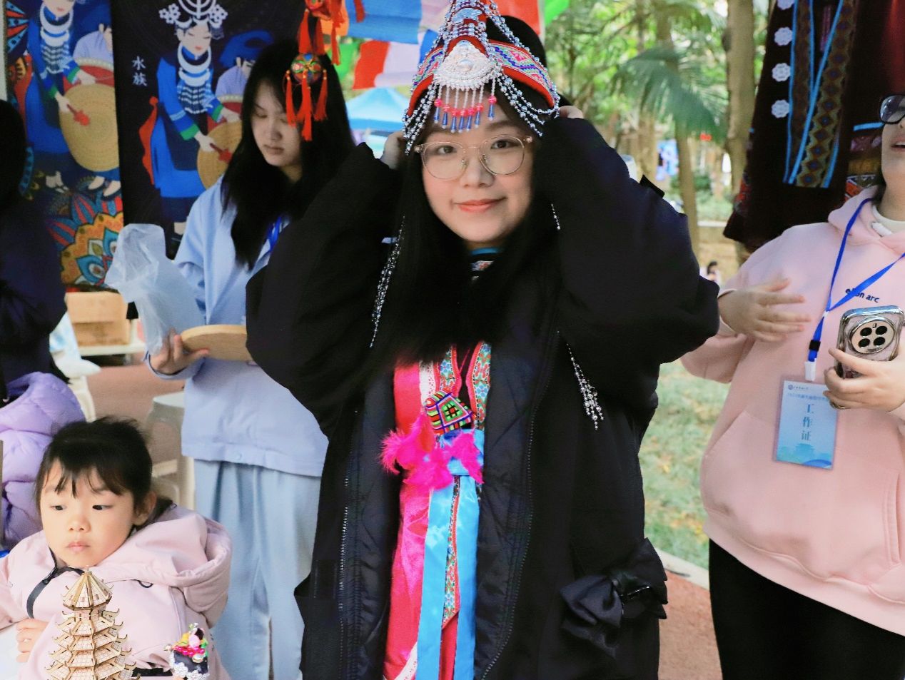 同学们体验民族头饰