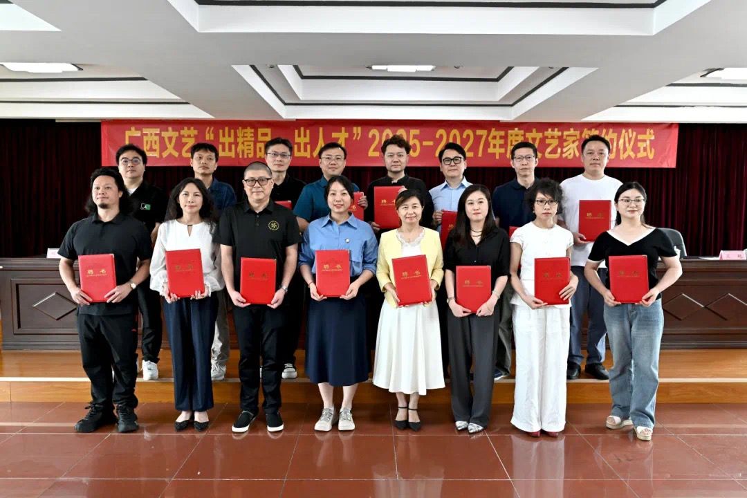 6月12日,广西文艺“出精品、出人才”激励计划2025-2027年度文艺家签约仪式在南宁举行,来自全区各地的17位广西优秀文艺家签订了创作扶持协议。william威廉中文官网创意写作教研室董迎春、刘俊昌(小昌)入选。