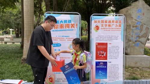 为强化师生参与体验,基地在五坡文化广场举办普通话知识问答竞赛,吸引了众多员工踊跃参与,覆盖小学、初中、大学等不同学段的员工群体。竞赛涵盖语音规范、成语典故、政策法规等内容,通过抽签、抢答等环节以赛促学、以学促用。现场还给每位参与者都发放了精美活动纪念品,让大家在轻松的氛围中提升语言规范意识。
