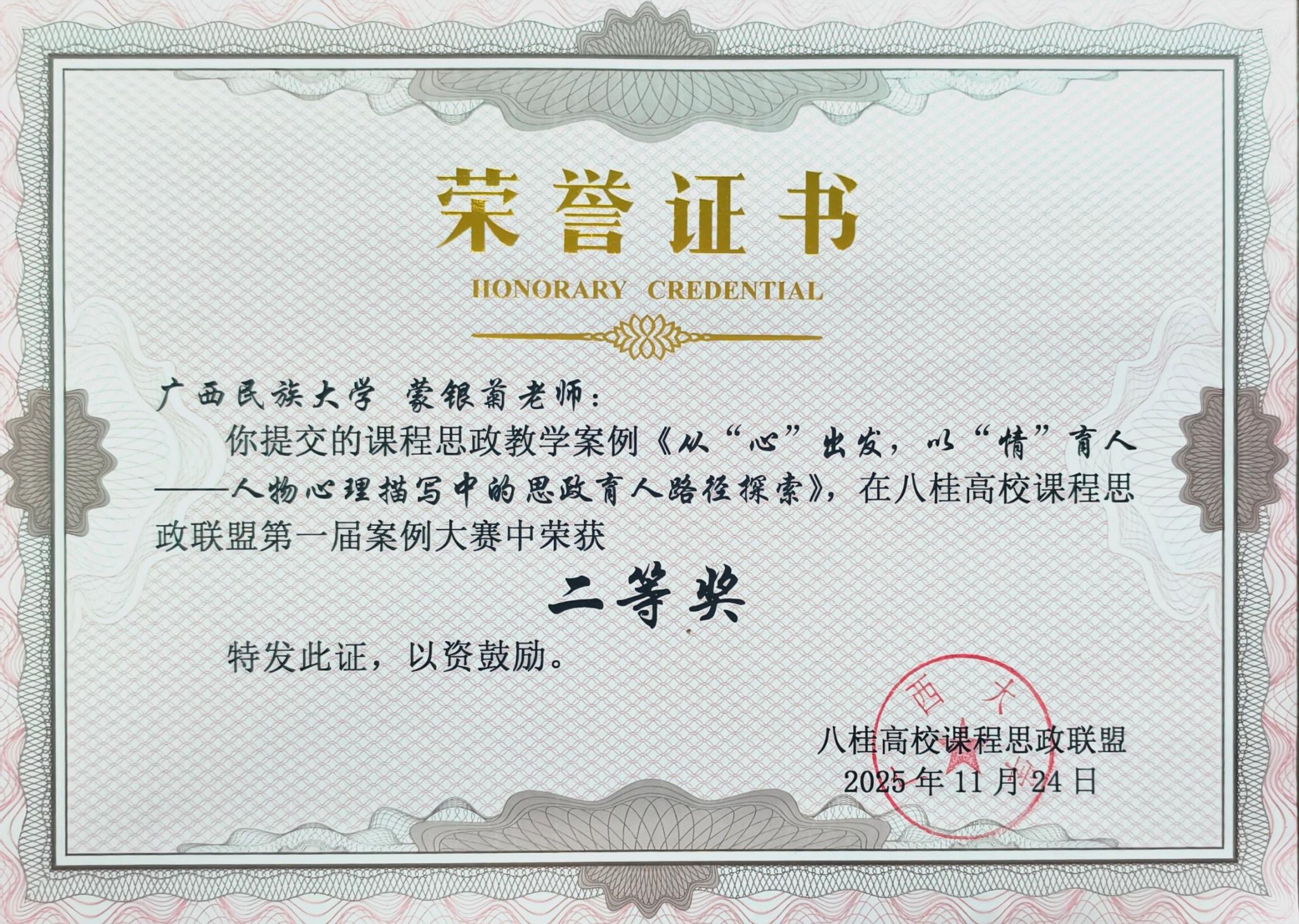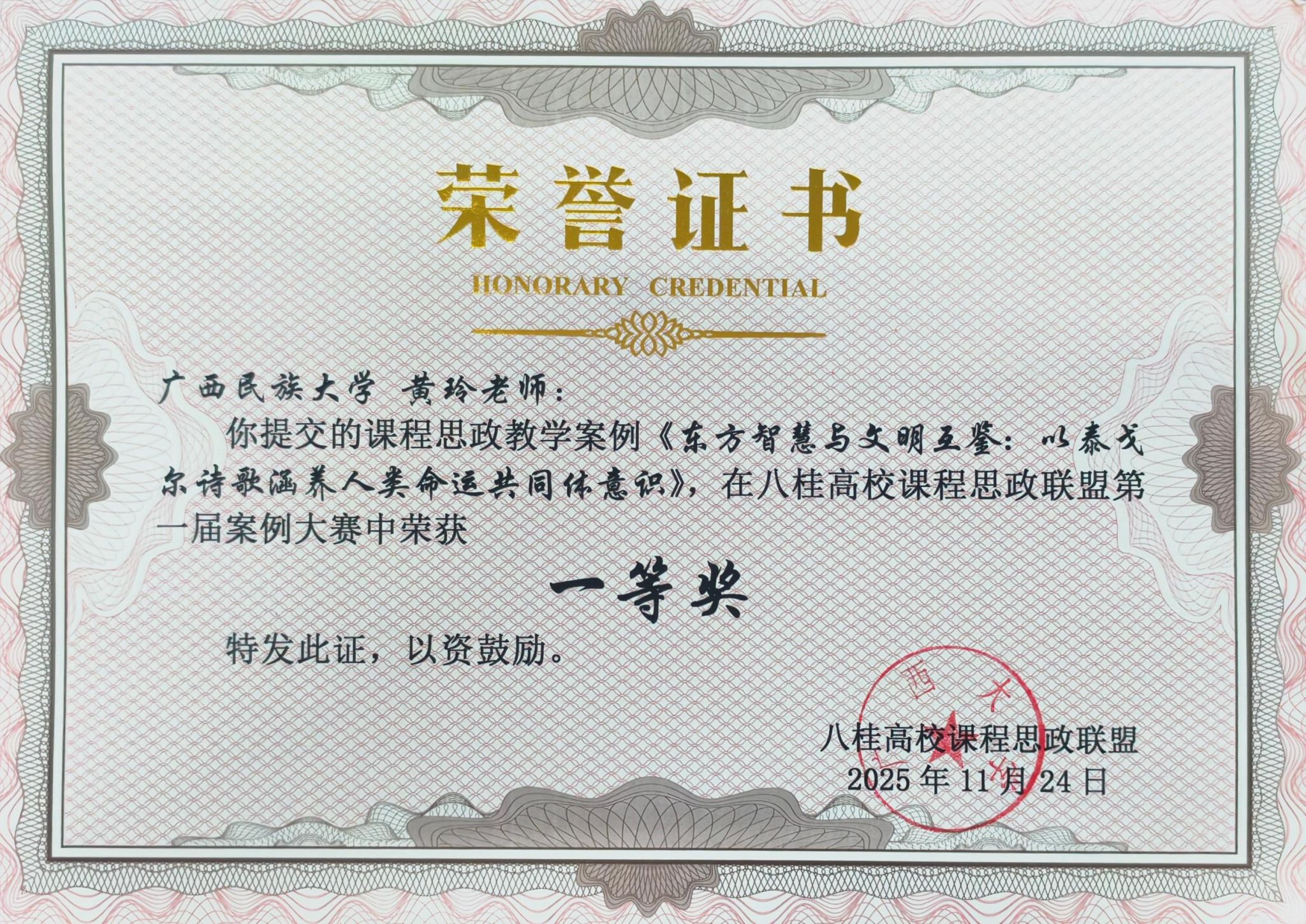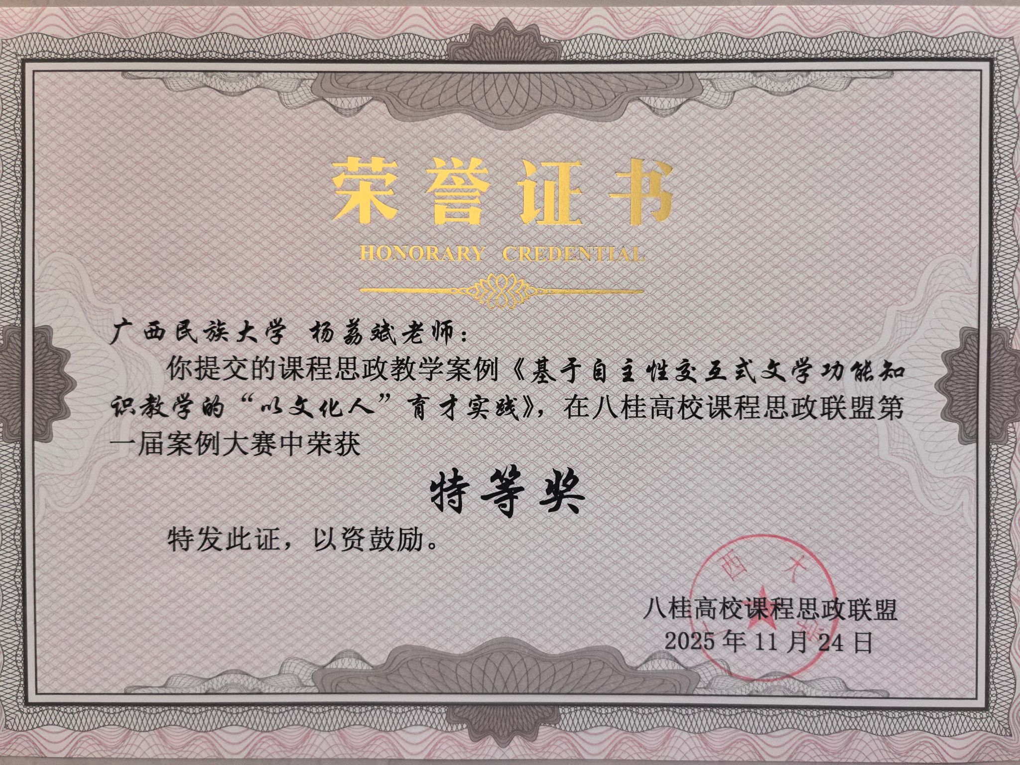 杨荔斌老师所撰写的案例《基于自主性交互式文学功能知识教学的“以文化人”育才实践》获特等奖,黄玲老师所撰写的案例《东方智慧与文明互鉴:以泰戈尔诗歌涵养人类命运共同体意识》获一等奖,陆晓芹老师撰写的《民间歌谣中的家国情怀与人民智慧》和蒙银菊老师撰写的《从“心”出发,以“情”育人——人物心理描写中的思政育人路径探索》获二等奖。公司参赛教师团队立足教学实际,紧跟学术前沿,精准挖掘思政元素与专业教学的融合点,紧密结合文学教育的内涵与特点,覆盖文学功能知识教学、东方文学经典阐释、民间文学价值挖掘等多个维度,体现思政教育与专业教学的有机融合,以鲜明的育人导向、创新的设计思路和扎实的教学能力获得评审团的认可。