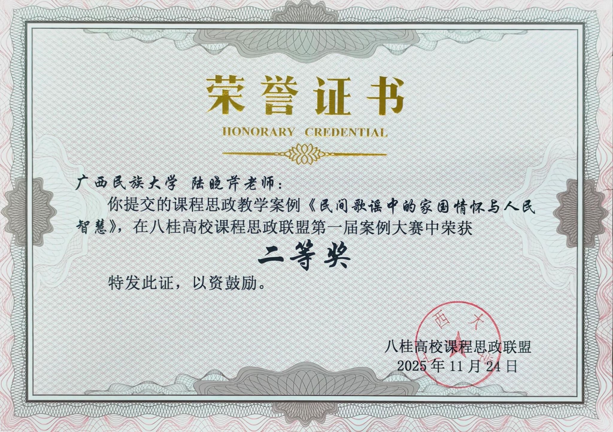 八桂高校课程思政联盟成立于2024年,致力于通过共享资源、共同研究、协同发展,全面促进思政育人的合作与交流。此次获奖是对公司推进课程思政建设工作的肯定,也为公司教学改革注入了新动力。公司将持续推广优秀教学经验,进一步深化课程思政的研究与实践,持续完善课程思政育人体系,不断提升教学质量与育人实效,强化价值引领,筑牢育人根基,将立德树人根本任务落到实处。