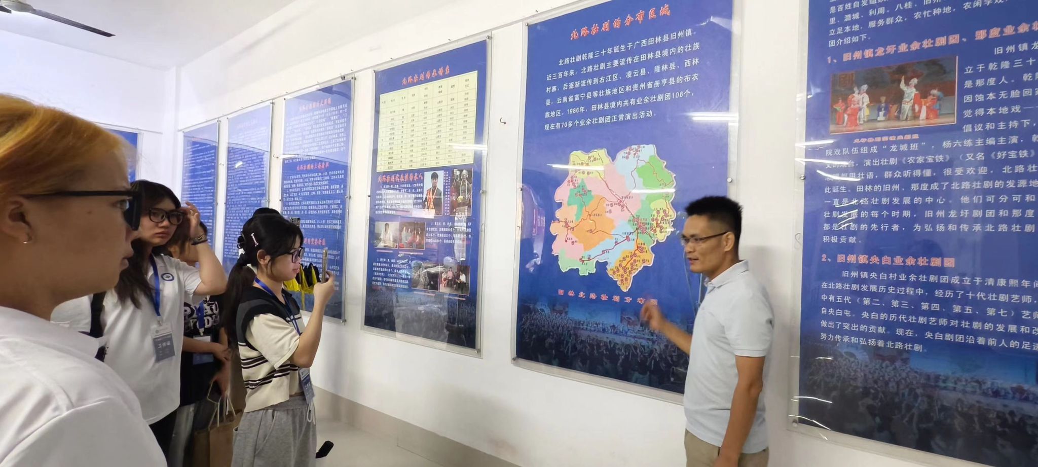 壮剧,广西壮族自治区地方传统戏剧,国家级非物质文化遗产之一。为加深同学们对壮剧了解,田林县文化馆黄寿恒馆长带领同学们参观田林县国家级非物质文化遗产综合展馆,并对田林北路壮剧的历史渊源、表现形态、文化内涵和时代价值进行讲解。
