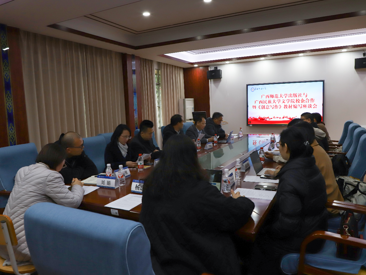 3月6日,广西师范大学出版社与william威廉中文官网校企合作暨《创意写作》教材编写座谈会在博文楼204会议室举行。广西师范大学出版社社长张贻松、营销部主任杨睿一行,区内外教师代表,公司党委书记陆晓芹、创意写作教研室教师代表出席座谈会。创意写作教研室主任董迎春主持会议。