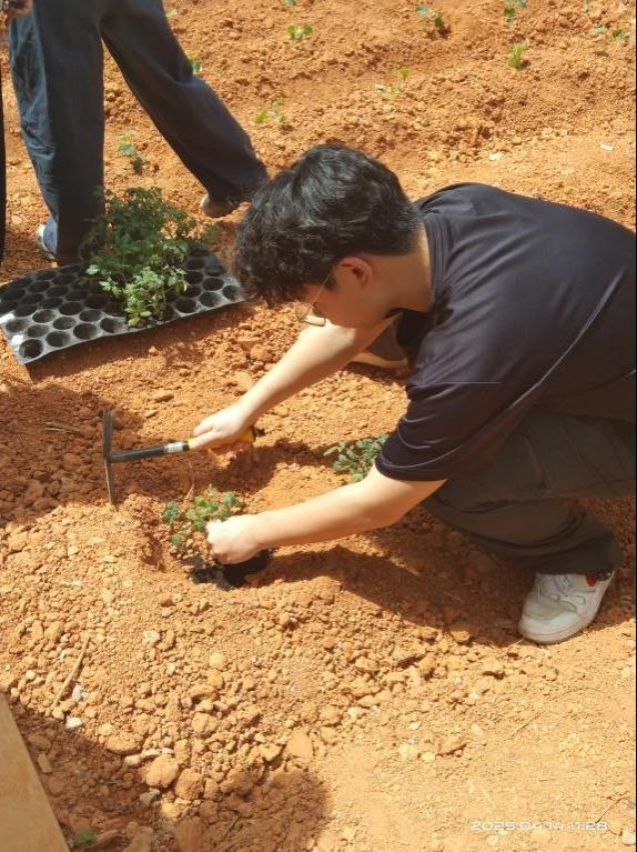 平整土地、筛选碎石、敲碎土块,翻土开畦......一系列农耕必备的操作环节上演了。当日清晨,各班员工手持锄头、铁锹等农具,在老师的指导下,分组投入翻土、除草、碎土、平整土地等工作中,为后续种植蔬菜、水果做好田垄规划。大家在泥土的芬芳中体会“一粥一饭,当思来之不易”的深意,更在躬身实践中感悟“民生在勤,勤则不匮”的传统农耕文化内涵。