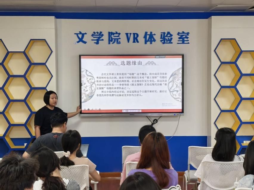 幸美灼、米豪、卢佳玉、胡艺凡、余芳羽等五位同学作为主讲人,围绕李碧华的代表作《霸王别姬》这一经典文本,分别以“从英雄悲歌到性别困局:溯源‘霸王别姬’母体浅析李碧华的《霸王别姬》”“悲剧美学视域下的《霸王别姬》:英雄叙事与个体毁灭”“《霸王别姬》中程蝶衣的悲剧形象与香港文化身份的双重书写”“解构的虞姬与嬗变的霸王——论《霸王别姬》中角色的性别流动与人格嬗变”“‘戏如人生’和‘活着便好’——从《霸王别姬》和《活着》看创伤印记与生存哲学”为展开分享。每位主讲人都对原著进行了深度挖掘,结合专业知识与个人感悟,带来了精彩的分享。