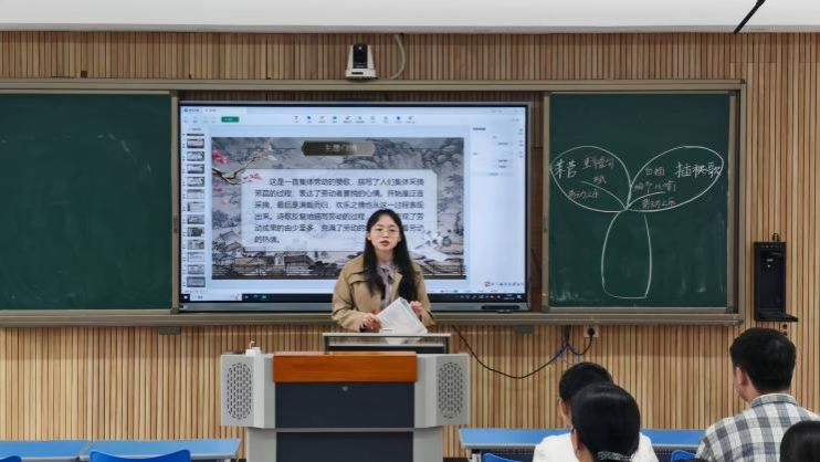 在题为《芣苢》《插秧歌》联读的展示课上,黄丽湘首先通过生动的AI动画视频,直观再现了西周与宋代的劳动场景,使员工在强烈的视觉对比中,初步感悟《芣苢》与《插秧歌》迥异的劳动氛围。随后,课堂以两首诗的核心动词为切入点,深入分析了《芣苢》“重章叠句结合赋体”的回环往复之美、《插秧歌》“白描辅以比喻”的生动传神之妙。最后,黄老师创设了情景体验与创意练笔环节,在品读与创作中深刻体悟劳动的欢悦与艰辛,从而深化对劳动之美的理解。