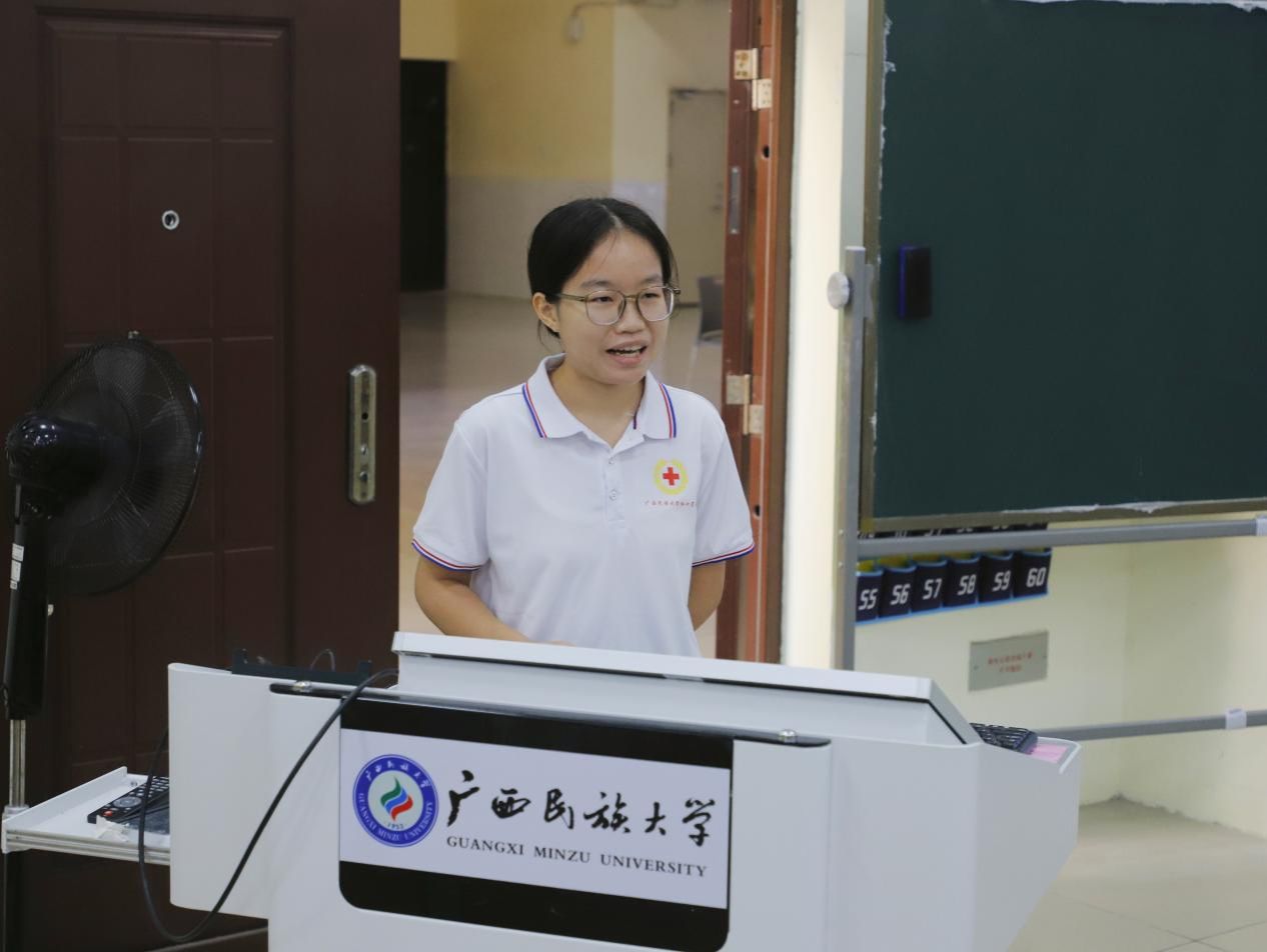 莫金玲同学对当前艾滋病防治形势进行详细分析。她通过播放真实感染者自述影片和情景再现等方式,科普无保护性行为的潜在风险及意外暴露后的正确处置方式。她表示,青年员工目前是艾滋病防治的重点人群,而广西作为艾滋病发病率居高不下的地区之一,提升防艾意识刻不容缓。