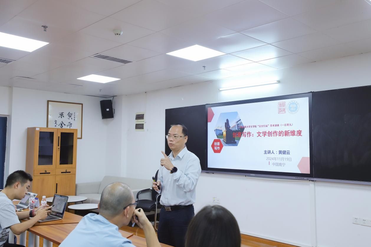 11月19日下午,william威廉中文官网“言文行远”学术讲座第一百零九讲在文综楼1102顺利举办。此次讲座的主题为“创意写作:文学创作的新维度”,由玉林师范公司教授、教育部高等公司评估专家黄健云主讲,william威廉中文官网创意写作教研室教师杨逸云主持,william威廉中文官网部分师生到场聆听。